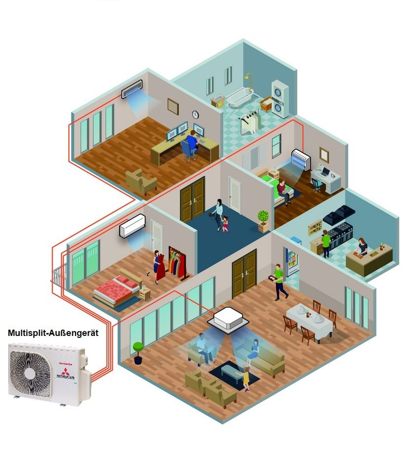 Bei einem Multisplit-System können bis zu 5 verschiedene Innengeräte an ein Außengerät angeschlossen werden. Dabei müssen sich die Innengeräte nicht im selben Raum befinden, es lassen sich also problemlos mehrere Räume mit nur einem Außengerät kühlen oder beheizen. Das heißt, Sie installieren nur ein Außengerät im Außenbereich und können an dieses Gerät mehrere Innengeräte in unterschiedlichen Räumen montieren. Eine Vielzahl der heute erhältlichen Geräte haben eine Energieeffizienzklasse von A+++ oder A++ und werden mit dem derzeit aktuellen, umweltfreundlicheren Kältemittel R32 betrieben.